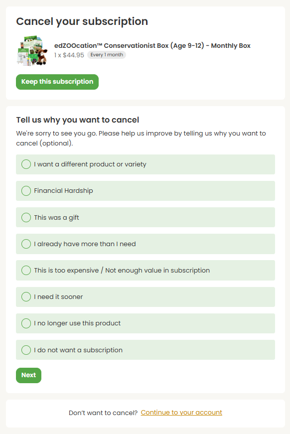 - You will be given the option to pause your subscription for one week, one month, or two months.