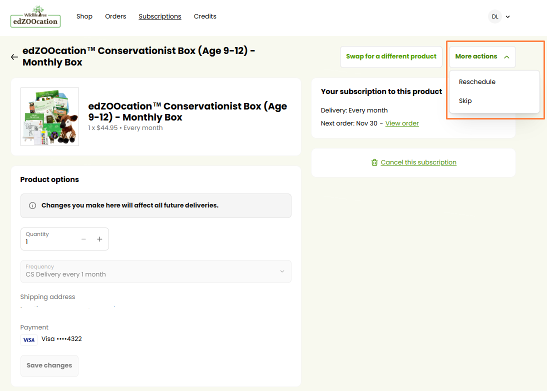 - Click on "More actions" then you can choose to either reschedule or skip this month's shipment.
