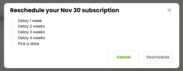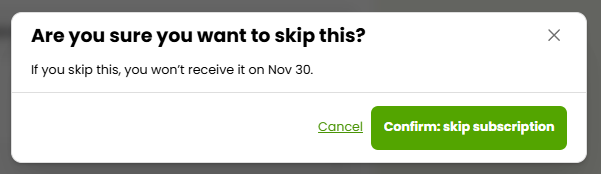 - You'll receive a pop-up either asking if you're sure you'd like to skip or when you'd like to reschedule next order.